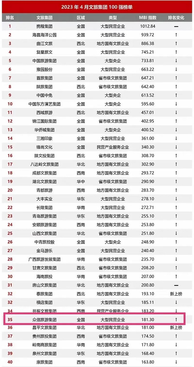 近日,《2023年4月中国文旅集团发展报告》发布,2023年4月文旅集团100强榜单出炉,众信旅游集团荣登文旅集团百强榜第35位,位列民营文旅集团前10位、民营旅行社排名第一。