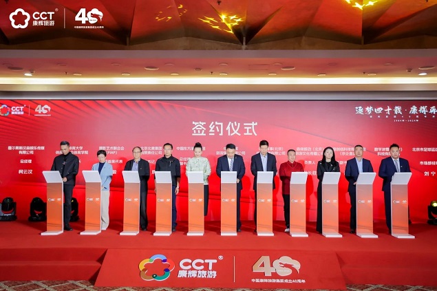 庆典期间,康辉集团与 10 家单位进行了“旅游+百业”的签约仪式,共同开启旅游合作新篇章,此次签约不仅标志着康辉集团在跨界合作上迈出了坚实的一步,更是对未来合作美好愿景的坚定承诺。