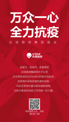 【2020年1月31日,北京】为了更广泛地筹集防护物资,支持抗疫一线的医护工作,众信旅游集团近日启动防疫关爱行动,向旗下海外子公司及遍布世界各地的旅业合作伙伴发起倡议,号召有能力、有条件、有意愿的众信旅游集团海外公司行动起来,发挥资源优势,尽己所能,优先、但不限于...