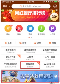 此外,为了提升消费者境外旅行消费服务品质,保障更好的旅行体验,美团旅行首次尝试使用了“快筛”的形式,系统通过LBS自动推送优惠信息,消费者在这15个境外城市的美食、购物和景点玩乐频道,通过点击“银联特惠”按钮,便可以一键查看附近所有的商户优惠信息。