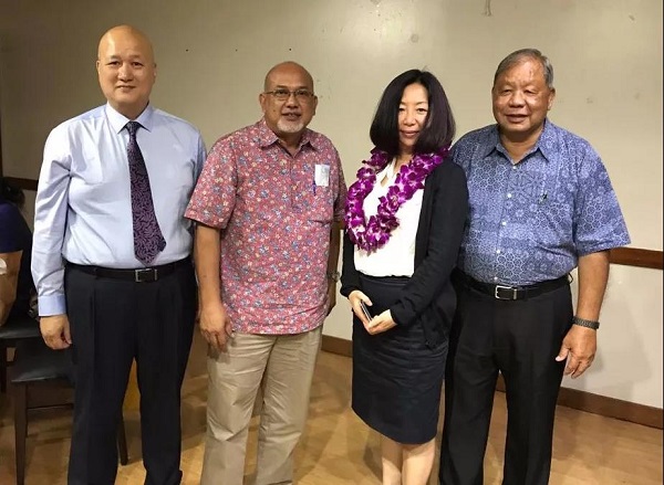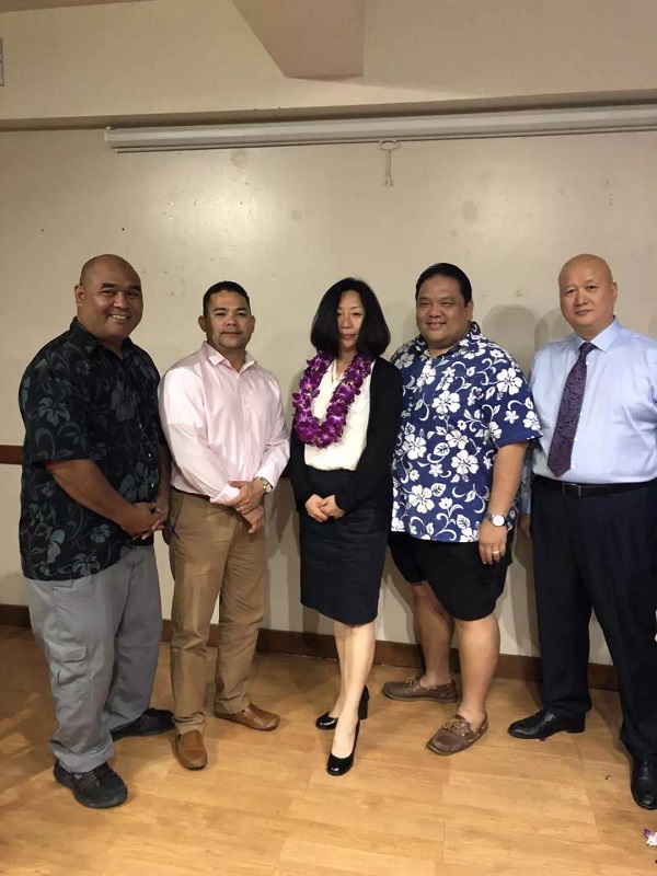 众信旅游高级副总裁林岩女士、TDI总裁朱汉强先生(左一)与塞班岛市长(右一),塞班岛议员(左二)
