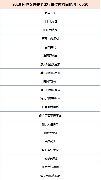 本次活动期间,主办方发起了2018环球女性安全出行体验(百代TOP20)评选活动,结合了专家评审、达人打分、大众投票三个环节的结果,最终评选出了2018环球女性安全出行最佳体验目的地百代TOP20榜单,斯里兰卡、日本北海道、阿联酋迪拜、葡萄牙波尔图、美国关岛等地区上榜。