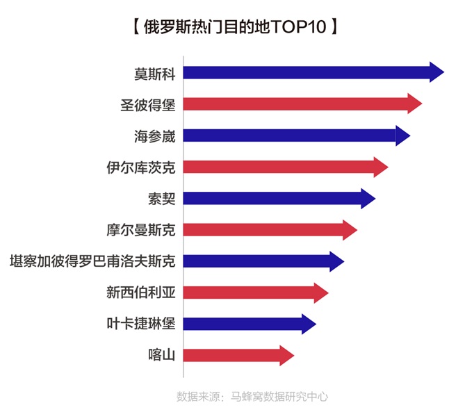 俄罗斯热门目的地排行前十的城市分别为莫斯科、圣彼得堡、海参崴、伊尔库茨克、索契、库尔曼斯克、堪察加彼得罗巴浦洛夫斯克、新西伯利亚、叶卡捷琳堡、喀山。世界杯赛事举办地占据其中五席。