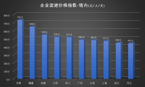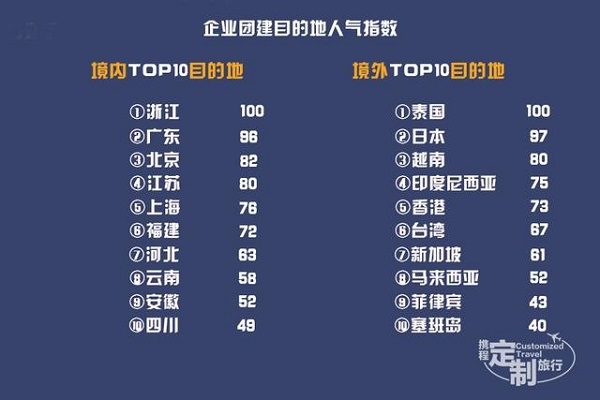 企业定制境内目的地前十为浙江、广东、北京、江苏、上海、福建、河北、云南、安徽、四川。境外的目的地前十为泰国、日本、越南、印度尼西亚、香港、台湾、新加坡、马来西亚、菲律宾、塞班岛。企业团建定制游的目的地境内和境外的比例为8:2。