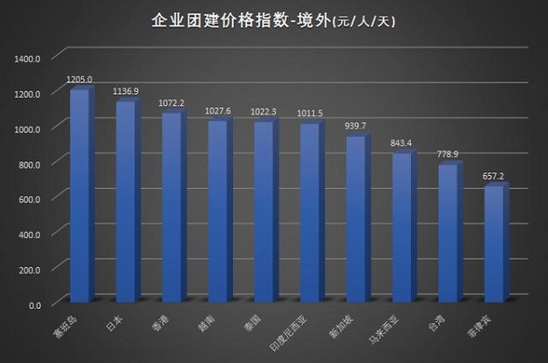 在境外前十目的地中,塞班岛1205元/人/天,价格最高;菲律宾657元/人/天,价格最低。
