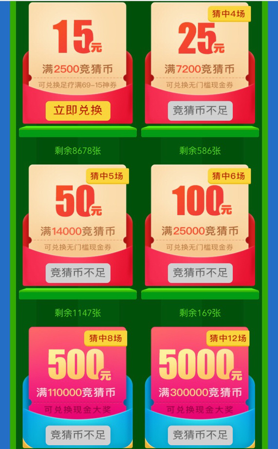 球迷用户可以在“燃情看球”活动页面,为每一场比赛投出不等额度竞猜币,根据胜负平等结果,可以获得不等倍数的竞猜币回报。所获得的竞猜币可以用于兑换美团无门槛现金券,猫眼、到餐、KTV、足疗等不同品类的满减券,以及最高达5000元的现金大奖。