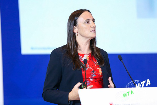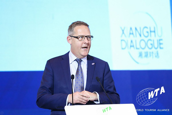 经过了短暂的午休后,下午的大会开始了,下午的活动由两场嘉宾演讲和两场专题对话组成。首先进行的是第一场嘉宾演讲。世界旅游联盟副主席、澳大利亚旅行商联盟首席执行官Jayson Westbury首先发表了《旅游的力量》的演讲,他在演讲中表示,旅游业是世界经济发展的支柱产业,旅游业帮助很多的地区脱贫,这对于中国来讲是非常重要的。也就是说,旅游在减少贫困方面作出了贡献,包括少数民族没有任何的产业增长,很多产业都是消亡的,更不要说增长,但是旅游业依然是一个朝气蓬勃的产业,我们需要政府积极来管理,来减少旅游业所造成的污染,旅游业被认为是一个清洁的可持续发展的产业,对于经济社会的发展具有重要的贡献。让人们到世界各地旅游,也是旅游产业成功的基石。最后,Jayson Westbury借助这次机会表达他的想法,WTA是代表着旅游业的未来,能够保证让生活更美好,让世界更美好。