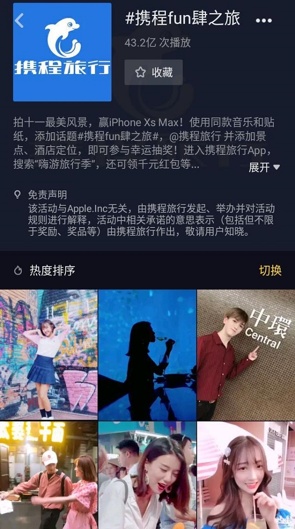在该话题下,无数的用户被带动,接连发布打卡短视频,似乎形成了一场打卡接力赛,在抖音平台的场域空间之中迅速激活话题流量,在短时间内累计播放量已经超过43亿次,令人惊叹。更重要的是借助十一出行高峰,在抖音全站用户心智中提前进行了目的地和携程品牌的预种草,为用户下一次出行想到携程埋下了伏笔。