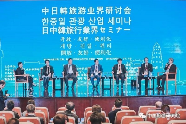 2018年10月26-27日,由中国文化和旅游部、韩国文化体育观光部和日本国土交通省共同举办,江苏省旅游局和苏州市人民政府承办的“第八届中日韩旅游部长会议”在苏州召开。会议期间,中国旅游研究院和苏州市旅游局共同承办的“中日韩旅游业界研讨会”于10月27日下午成功召开,主题为“开放•友好•便利化”。中国文化和旅游部部长雒树刚、韩国文化体育观光部长官都钟焕、日本国土交通省大臣石井启一出席研讨会并致辞。
