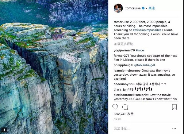 8月1日,2000名观影者徒步登上《碟中谍6》的取景地—布道台,观看了该片