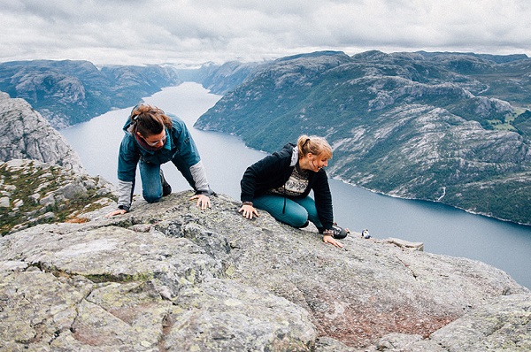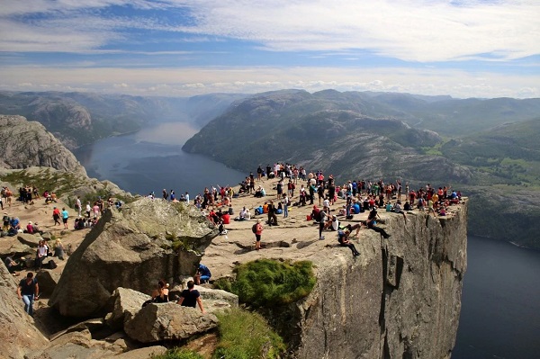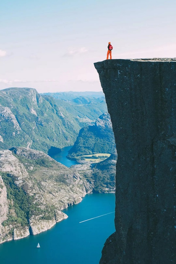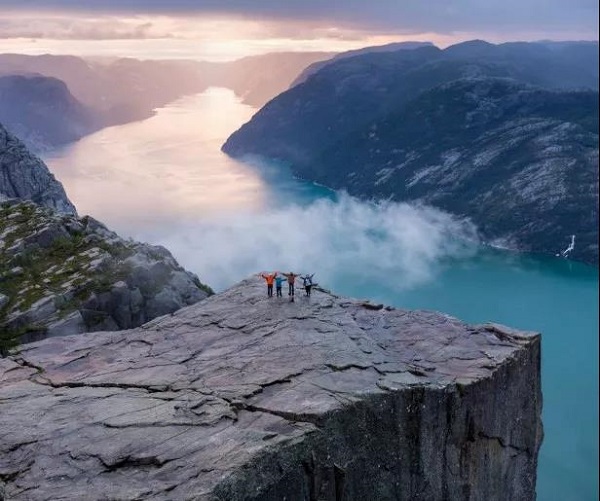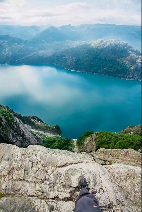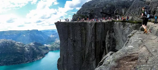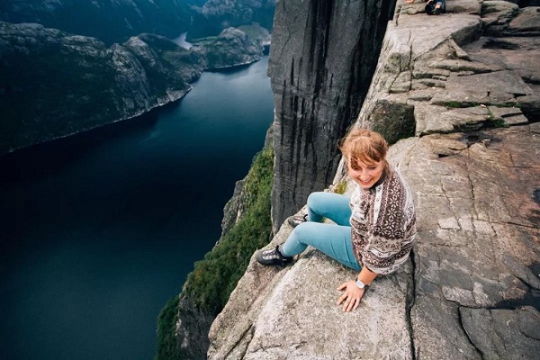 挪威政府为了不破坏自然之美未在悬崖上打造任何防护措施,勇敢者们在悬崖边镇定自若,仿佛地球就是他们的游乐场,胆子小的人们也不想错过机会,即使趴在崖边,也要此生无憾。