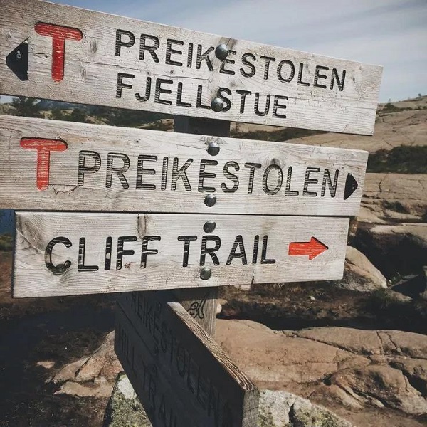 接近目的地会有一块木牌,指示右侧为 mountain trail,翻山越岭之后,会将你带到布道台上方。左侧则为cliff trail,可直接去布道台。