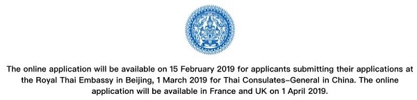 在线申请将于2019年2月15日在北京的泰国驻华大使馆启用;2019年3月1日在泰国驻中国总领事馆启用。在线申请还将于2019年4月1日在法国和英国启用。