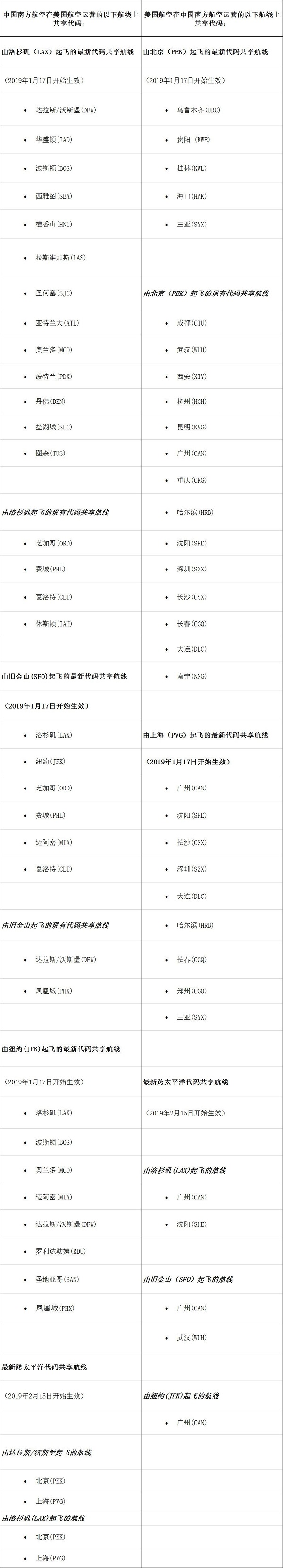 美国航空与中国南方航空将从本周起拓展伙伴关系,在由中美两国关键门户起飞的更多航线上共享代码。从2019年2月15日起,拓展后代码共享范围还将包括中美两国间九条跨太平洋航线。届时,双方代码共享范围将涵盖:北京和上海飞往中国境内的20条航线,由洛杉矶、旧金山和纽约飞往美国境内的21条航线,以及双方在中美间开通的所有远程航线上。