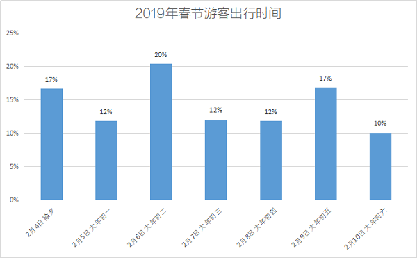从中青旅遨游网2019年游客出行情况来看,从除夕到大年初六七天假期内,游客整体出行时间较为平均,约在10%-20%之间,唯有除夕、初二、初五出行较为密集,但也在较为合理范围内。从中也可看出,随着带薪休假、企业年假等休假政策的日益合理,游客的旅游度假出行更加成熟,根据自身情况,合理安排出行成为人们的首选。