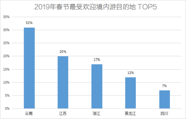 从国内旅游预定情况来看,云南、江苏、浙江、黑龙江、四川分别占据国内旅游热门旅行地前五名,既有避寒取暖、传统强势的云南产品,也有以黑龙江为代表,异军突起的冰雪旅游产品,充分体现了新消费时代人们对旅游消费多样的需求。