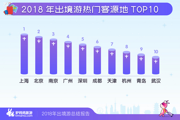 哪些城市的居民出境游热情最高?《报告》显示,上海、北京、南京、广州、深圳、成都、天津、杭州、青岛、武汉成为2018年出境游十大热门客源地。在目的地方面,泰国、日本依旧最火爆,同时随着反季节游的盛行,非洲、澳新等目的地出游人次增速较快,成为2018年的出境游市场的“黑马”。
