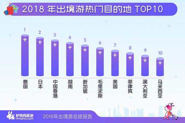 《报告》显示,2018年出境游热门目的地分别是泰国、日本、中国香港、越南、新加坡、毛里求斯、美国、菲律宾、澳大利亚、马来西亚。其中,受益于签证利好、行程短、直飞便利等因素,泰国、日本依旧是国人出境游的首选目的地。其中,泰国丰富的海岛资源、美食文化、异域建筑等都颇受游客追捧;而浪漫樱花、温泉、动漫文化等则成为日本旅游的“吸睛利器”。如驴妈妈平台“泰国曼谷芭堤雅沙美岛7日5晚游”、“日本本州东京、富士山、京都、大阪、名古屋6日5晚半自助游”等成为2018年的出境游爆款产品。