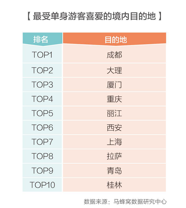 马蜂窝大数据显示,成都、大理、厦门、重庆、丽江、西安、上海、拉萨、青岛和桂林成为单身游客最喜爱的境内目的地。