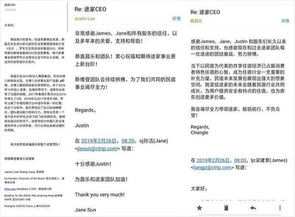 内部信落款显示是以携程集团董事长梁建章的名义发布。罗军随后在邮件中回应:“恭喜昌乐和团队,衷心祝福和期待途家事业更上新台阶。斯维登团队会持续拼搏。”杨昌乐则在邮件中表示“会竭尽全力带领途家,砥砺前行、不负众望”。