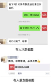 春节期间,一位正在普吉岛游玩的女士发起求助,她突然发生腹痛,急需就医,但是由于她是独自出游,在前往医院和语言沟通上都出现了不小的问题。场面非常焦急,隔着屏幕,都能感到游客的无助。这个时候,SOS专员与“携程普吉服务中心”取得了联系,紧急安排服务人员陪同游客前往医院,终于在协助下完成了治疗,游客第二天向SOS团队进行了反馈,并发朋友圈进行了感谢。
