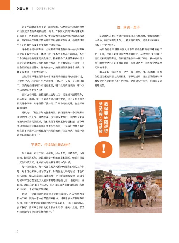 勇敢活出自真,欢迎本期封面人物金铉猎奇环球旅行创始人施铉雨女士,迎风傲立,笑谈真我。