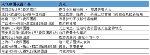 携程跟团游也上线了大量含有夜游体验的主题线路,十大夜游特色线路包括:西双版纳私家团、厦门鼓浪屿半自助游、西藏拉萨跟团游等,提供夜宿植物园看萤火虫、夜游桂林城、阿里观星、西安曲江包车夜游、重庆夜游洪崖洞、上海迪士尼看烟花等体验。