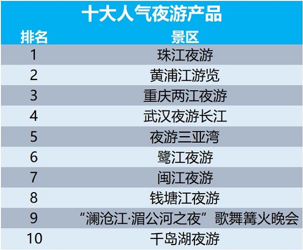 而这些城市的人对哪些夜游产品更感兴趣?根据携程门票平台数据,珠江夜游、黄浦江游览、重庆两江夜游、武汉夜游长江、夜游三亚湾、鹭江夜游、闽江夜游、钱塘江夜游、“澜沧江湄公河之夜”歌舞篝火晚会和千岛湖夜游人气最高,如今游客对于夜游的消费,更多还是集中在夜晚游船上。