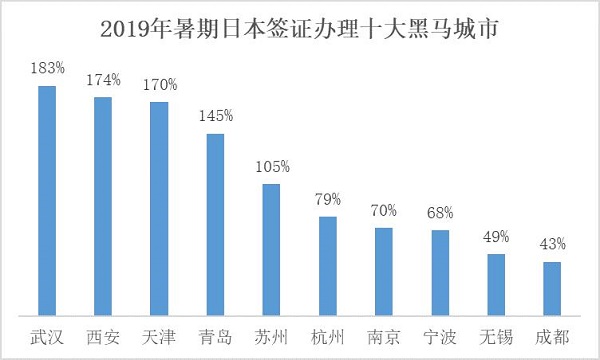从增幅来看,武汉、西安、天津、青岛、苏州、杭州、南京、宁波、无锡、成都排名前十。其中,武汉、西安、天津为暑期日签办理黑马城市,今年办理日本签证的游客相比去年增长接近一倍。从办签量可以看出,二三线城市赴日旅游快速升温,尤其是以一些中西部代表城市尤为明显。