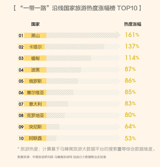报告显示,“一带一路”沿线国家旅游热度均有不同程度的上升。2019年上半年旅游热度同比涨幅排在前十的国家中,欧洲国家占据六席。热度上升最快的目的地为黑山、卡塔尔和缅甸,涨幅分别为161%、137%和114%。