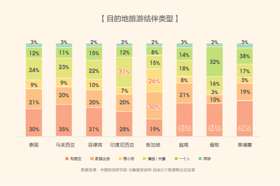 性价比高的东南亚地区一直很受中国游客的青睐,这里最具吸引力的是海岛休闲度假游,如泰国、马来西亚和菲律宾等,适合各种类型的出游人群,能满足多种度假需求。其中,印度尼西亚虽同属于海岛游,但更具差异化特色,巴厘岛作为最热门的结婚和蜜月海岛之一,受到更多情侣或夫妻的喜爱。柬埔寨、缅甸和越南,这些消费水平相对更低,且拥有更为浓郁的人文风情的目的地,吸引众多年轻游客结伴去探索,在旅游中感受文化,在文化里享受旅游。此外,数据还显示,缅甸最受“独行客”的喜爱,这片被称为“佛教之国”的土地,有着悠久的历史和灿烂的文化,适合一个人漫游品味。