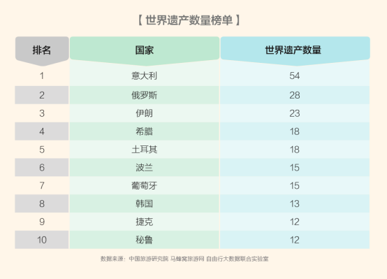 “一带一路”沿线国家和地区拥有丰富的世界遗产资源。其中,意大利拥有数量最多的世界遗产,多达54项,包括49项文化遗产和5项自然遗产。在众多文化遗产中,城市历史中心遗产占据7项,包括佛罗伦萨历史中心、那不勒斯历史中心、锡耶纳历史中心等。排在第二、三位的是俄罗斯和伊朗,分别拥有28 项和 23 项世界遗产。