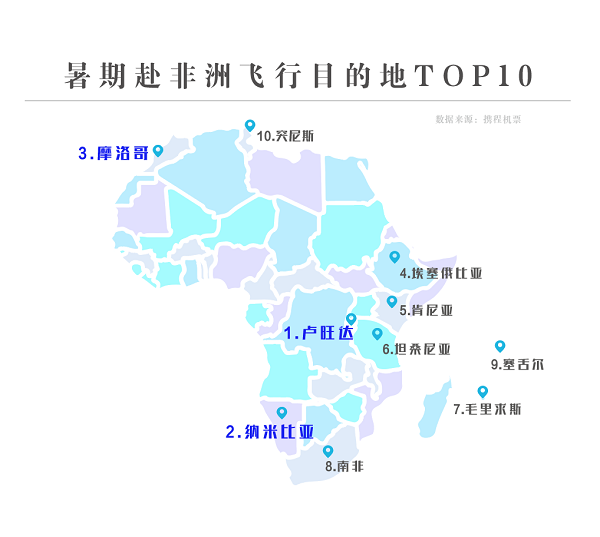 携程机票大数据显示,今年暑期,非洲避暑游十大热门目的地依次为卢旺达、纳米比亚、摩洛哥、埃塞俄比亚、肯尼亚、坦桑尼亚、毛里求斯、南非、塞舌尔、突尼斯。其中,飞往卢旺达机票预订量同比增长200%,飞纳米比亚同比增长超过170%,飞摩洛哥同比增长超过140%。