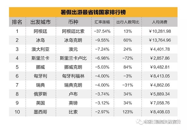 人民币破七,赴欧旅游汇率正好。据8月7日携程发布的最新“汇率旅游排行榜”显示,相比去年同期,冰岛、挪威、匈牙利、瑞典、俄罗斯、英国暑期汇率跌幅较大,也是近期最划算的境外旅游目的地。超优惠的汇率吸引了更多中国游客前往欧洲各国,携程数据显示,今年暑期通过平台报名跟团游、自由行、定制游等产品,前往挪威、冰岛的游客同比去年分别增长了84%、60%。前往俄罗斯、英国的游客均增长34%。从人均旅游费用看,前往瑞典、匈牙利的游客人均消费降低了23%、12%。