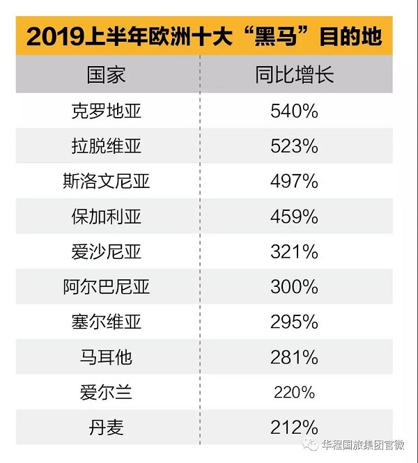 2019年上半年,根据携程旅游数据,十大黑马目的地分别是克罗地亚、拉脱维亚、斯洛文尼亚、保加利亚、爱沙尼亚、阿尔巴尼亚、塞尔维亚、马耳他、爱尔兰及丹麦,其中,上半年前往克罗地亚的游客人数同比上升了540%。