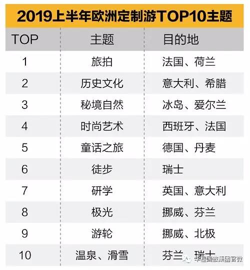 数据显示,今年上半年通过平台报名定制游产品前往欧洲的游客人数同比上升了315%,报名定制游赴欧游客占赴欧游客总人数的8%。根据游客的定制需求,十大欧洲定制游主题备受关注: 旅拍、历史文化、秘境自然、时尚艺术、童话之旅、徒步、研学、极光、游轮、温泉滑雪。