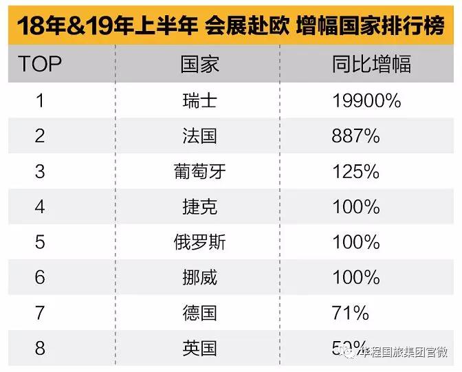 增幅最快的会奖目的地国家:瑞士、法国、葡萄牙、捷克、俄罗斯、挪威、德国、英国。瑞士同比增幅最大,增幅比例19900%。捷克、俄罗斯、挪威,并列倍增,德国、英国,一直是MICE团组青睐的目的地国家,常年保持稳中有升的态势。