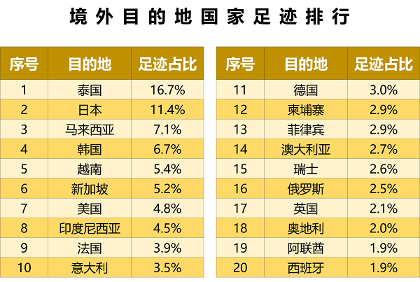 整体来看,泰国、日本、马来西亚、韩国等亚洲国家的足迹数量排名较高。欧洲则是另一足迹较为密集的大洲,法国、意大利、德国等8个欧洲国家,均进入排行榜前20。