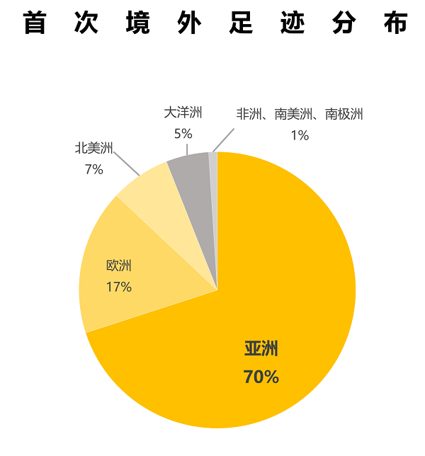 拥有出境足迹的用户中,70%选择了亚洲国家走出第一步,17%的用户的第一次出境去往欧洲,7%的用户首次境外足迹在大洋洲,5%的用户首次出境选择北美洲,仅有1%的用户首次境外足迹落在非洲、南美洲及南极洲。