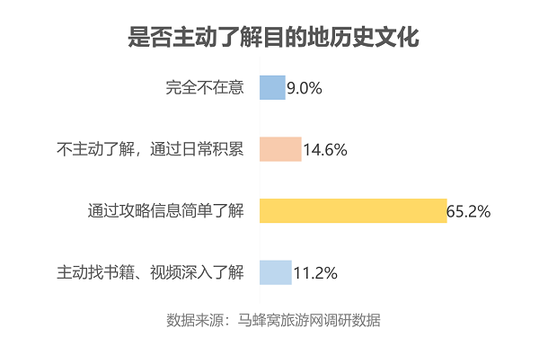 白领对于目的地文化历史的关注也在持续提升。76%的人表示会在出行前主动了解相关历史文化,其中,11%的人甚至会专门搜寻书籍、视频等资料进行深入了解。对于白领人群而言,旅游已经不再是打卡、观光,他们有着更深层次的旅游需求,文化已经成为重要的旅行动因素。
