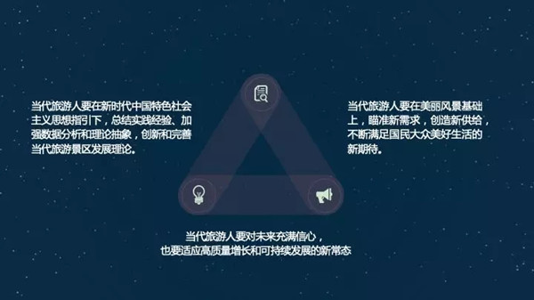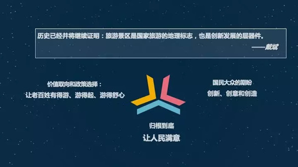 很高兴又一次代表中国旅游研究院课题组跟大家交流我们的研究成果。我主要跟大家交流我们主要的观点和核心数据。我们研究报告主要的指导意见都是在戴院长带领下,有一个核心的认识。首先历史已经将继续证明旅游景区是国家旅游的地理标志,也是创新发展的底层器件,这刚才戴院长说过,也是我们将近十年课题组得出的结论。关于景区的发展,总结来说,首先是我们的价值取向和政策选择就是让老百姓有得游,游得起,游得舒心。这里面反映出来我们国民大众对旅游景区发展企盼就是六个字:创新、创意和创造。就是归根到底,我们要做的就是让人民满意,这是戴学锋老师说过的我们核心价值趋向。