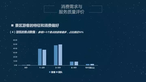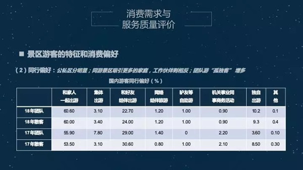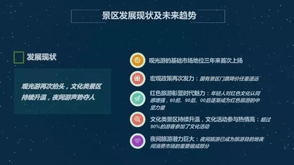 主要是观光游再次抬头,文化类景区持续升温。夜间游声势夺人。首先是我们数据调研得出的观光游基础市场地位三年来首次上扬。后面的消费者具体数据我之后跟大家交流。
