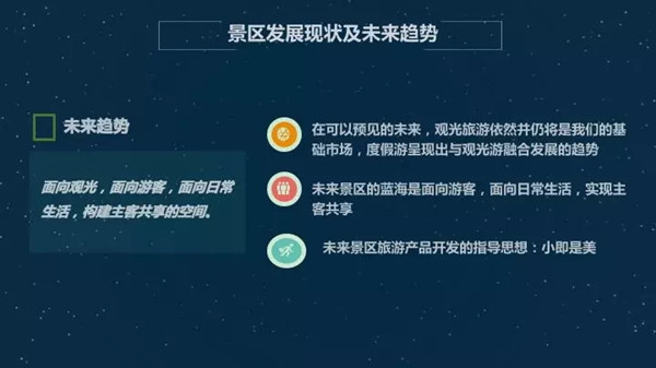 未来旅游景区产品开发方向:小即是美是一个方面,我们过去讲大投资,大放牧,动不动就是世界级,全球唯一,国内唯一。现在应该说是这个趋势有明显的变化了,以前有政府背书,房地产利润的兜底也许还可以。但是现在很明显,应该是注重与日常生活场景相结合的产品。