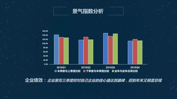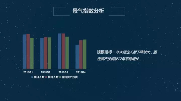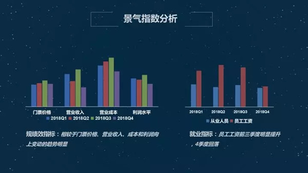 景气指数,仍然是小幅波动,整体平稳,向前发展。具体来说行业绩效,企业家开年之初对景区行业信心高涨,随后经历了低谷然后保持一定平稳,同比来说,跟2017年企业的绩效,企业家三季度对自己信心值达到巅峰,到年末稍显悲观。这是我们整个旅游经济的指向。规模性指标,年末预定人数下降较大,固定资产投资较2017年平稳增加。绩效里面相较于门票价格,营业收入,成本和利润向上变动的趋势比较明显,就业指标,员工工资,前三季度明显提升,四季度回落。我想这符合我们旅游景区在淡旺季的体现。一般都是在三季度达到巅峰值。