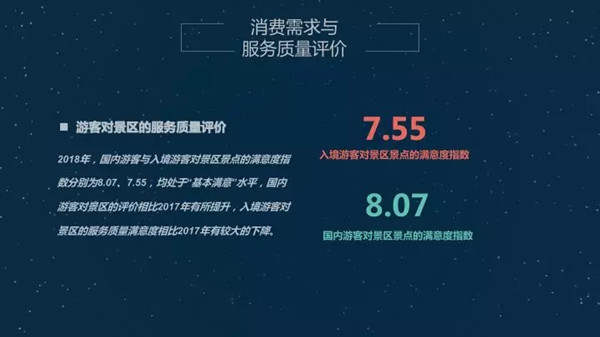 消费需求与服务质量评价方面,游客追求更高品质的体验。2018年,国内和入境游客对景区满意度指数,大家可以看出来,入境游客相较于2017年,入境游客满意度评价有比较大的下降的。但是国内游客对景区景点满意度高于其他的涉旅行业的,也同比去年满意度上升的。这是2017年和2018年变化比较大的指标。