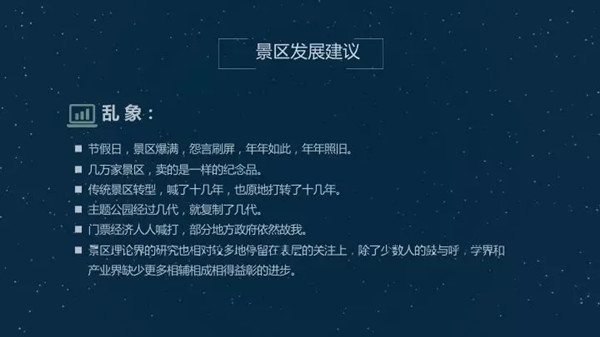 国有景区门票降价是势在必行,去年一年,我们的调研发现,有一些景区对门票降价还是有疑问的,还是心存侥幸,认为是一时政策取向。实际上这是一个势在必行的价值取向,从发改委密集的出台政策能看出来。这是延伸我们景区产业链,发展更多元化产品的手段。那么景区发展建议呢?重视理论指导实践,刚才戴院长也讲,没有实践支撑的理论是空洞的。没有理论指导的实践是盲目性比较多的。我们景区应当说是实践走在理论的前面,其实我们也不缺理论。缺的还是理论和实践之间这种相得益彰的,齐头并进的现象。大家都是各自为战。