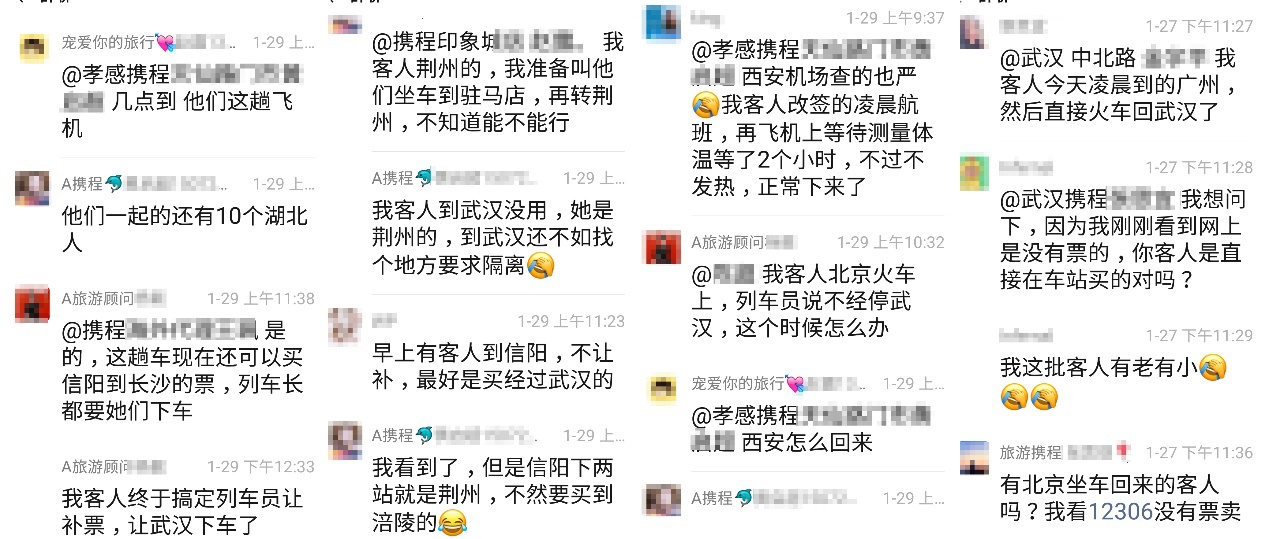在一个个携程门店群里,旅客的求助信息不断发上来。“我的客人在北京上火车,列车员说不经停武汉,怎么办?” “这趟车网上已经没有票,你的客人直接在车站买到票吗?” “他们有老有小,我担心就算去车站也不一定能买到,是否还有别的交通方法……”