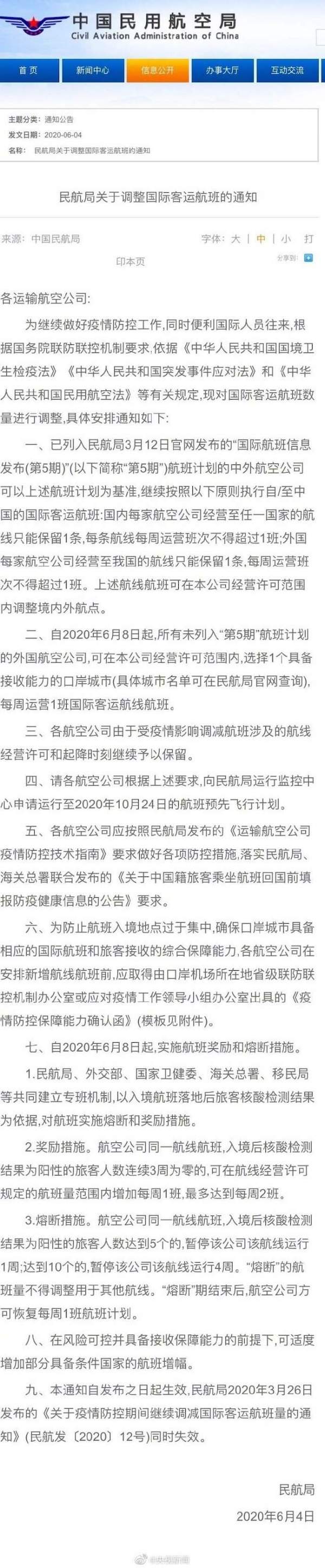 九、本通知自发布之日起生效,民航局2020年3月26日发布的《关于疫情防控期间继续调减国际客运航班量的通知》(民航发[2020]12号)同时失效。
