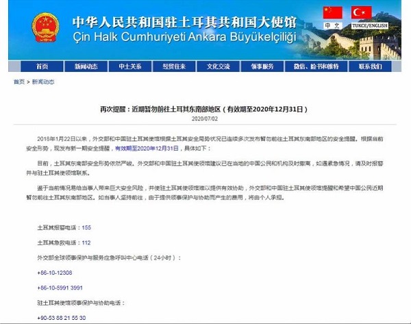 文章称,2018年1月22日以来,外交部和中国驻土耳其使馆根据土耳其安全局势状况已连续多次发布暂勿前往土耳其东南部地区的安全提醒。根据当前安全形势,现发布新一期安全提醒,有效期至2020年12月31日,具体如下: