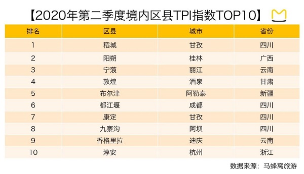 马蜂窝日前发布的《2020年第二季度在线旅游资产指数报告》中,就首次关注了国内的区县级目的地。该报告显示,国内在线旅游资产指数(TPI)最高的5个区县分别为四川甘孜的稻城县,广西桂林的阳朔县,云南丽江的宁蒗彝族自治县,甘肃酒泉的敦煌市(县级市)和新疆阿勒泰的布尔津县。一些刚刚入选第二批全国乡村游重点村的乡村所在区县TPI指数也出现大幅上涨,例如合肥长丰县TPI指数上涨743%,邯郸涉县TPI指数上涨628%。